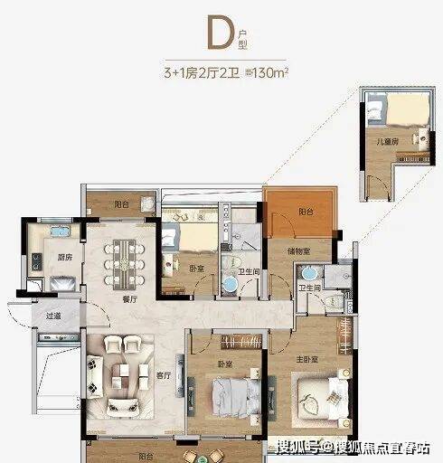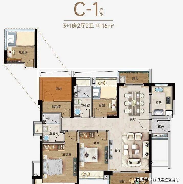 【建面约116㎡阔景四房】高得房率 I 高配入户花园 I 干湿分离 I 南北双阳台