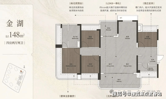 建面148平4+1房两卫,独立入户玄关,整体面宽达到16米,LDKB一体化设计,客厅开间6.6米,主卧面积也是30平。
