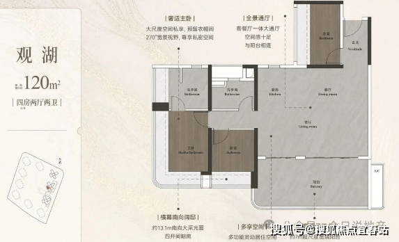 建面132平四房两卫,横厅南北对流设计,超50平的大方厅,约5.8米的景观阳台,主卧面积也有30平,带独立衣帽间。