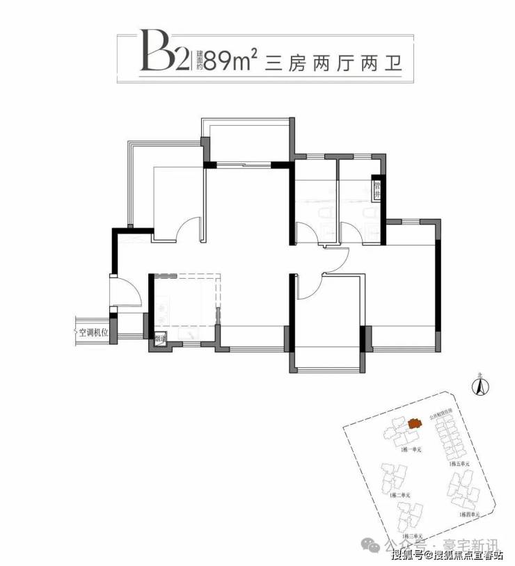 一:建面约89平方A1户型三房两厅两卫