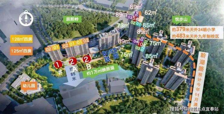 项目首推户型为建面约73-88㎡三房,住宅全南向布局,板楼可南向一线望映辰湖。
