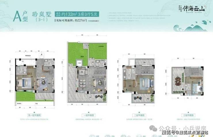 聆岚墅A户型:建筑面积约132㎡,实际可用面积约227㎡(不计花园及露台)