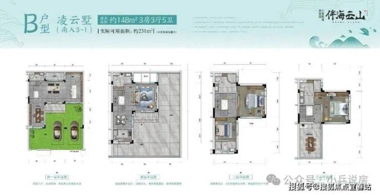 凌云墅B户型(南入户)建筑面积约148㎡,实际可用面积约231㎡(不计花园及露台)