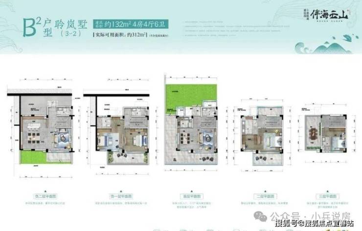 聆岚墅B2户型:建筑面积约132㎡,实际可用面积约312㎡(不计花园及露台)