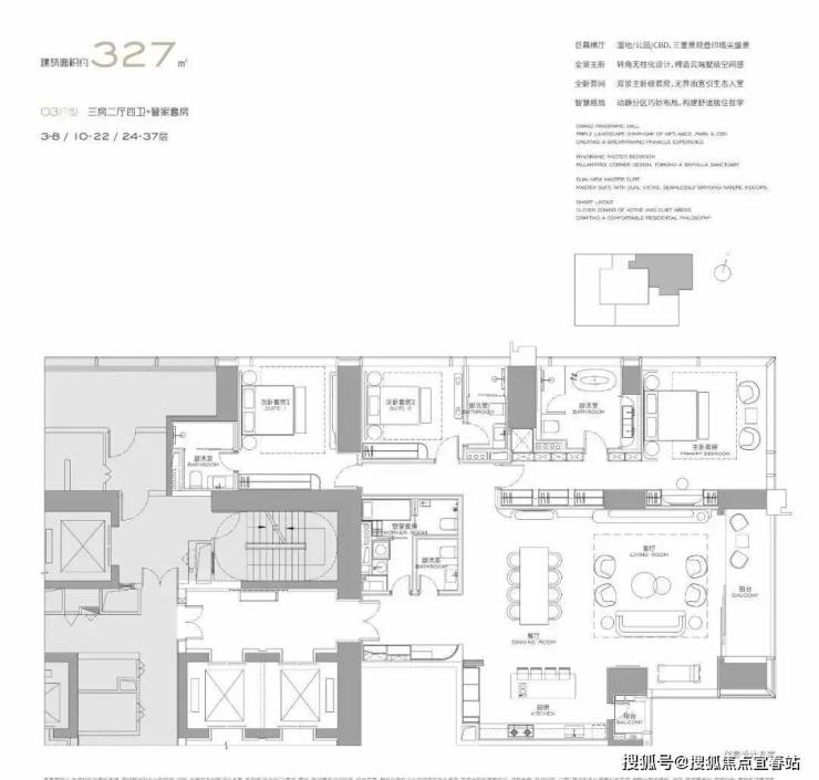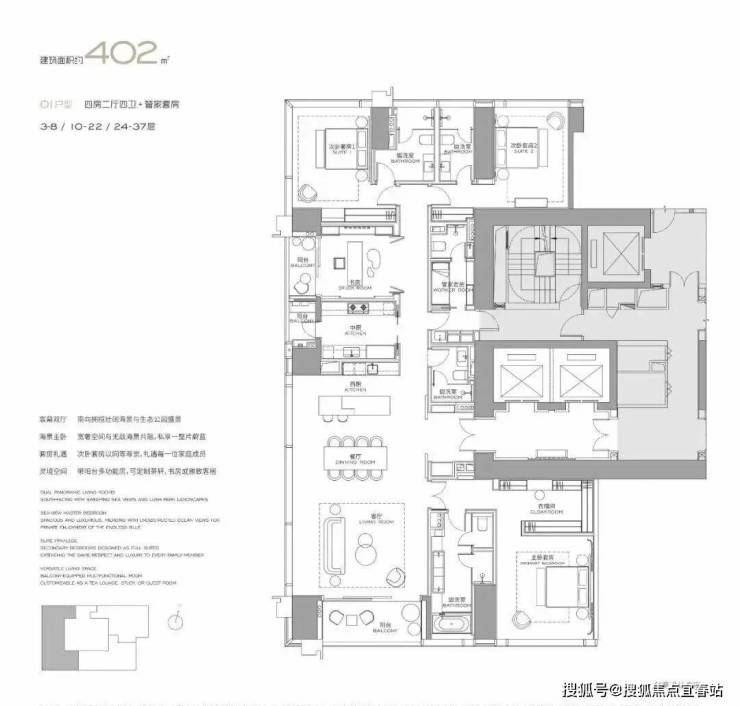 南北通透三面采光,顶奢总统套房规格,270°全景套房,享受湿地/公园/CBD景观,都是套房设计,更具私密性,中西厨分离。