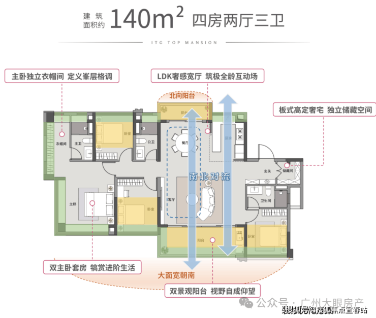 140平四房三卫,不超豪宅线做四房三卫,挺不错的。只在8#楼小高层,专梯入户。南北双阳台,格局和123平很像,可以看作125平户型的升级版。