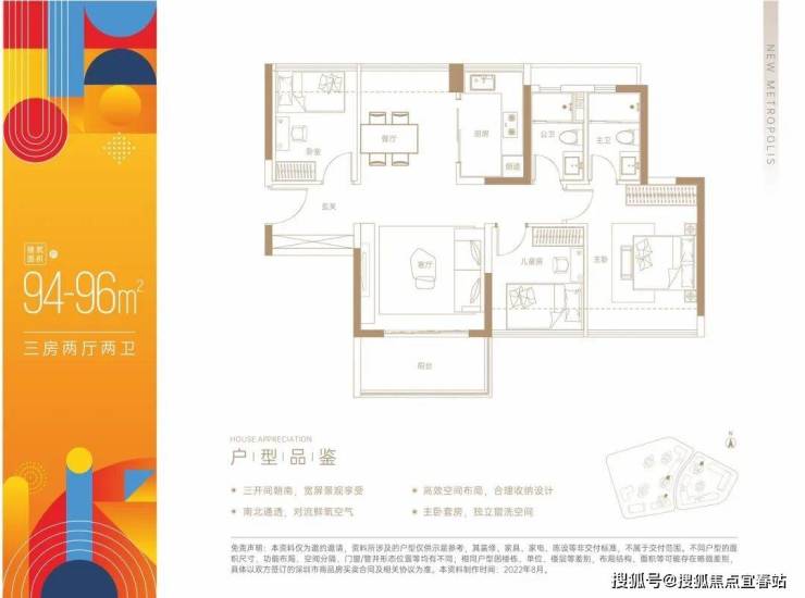 建面约94~96㎡三房两厅两卫
