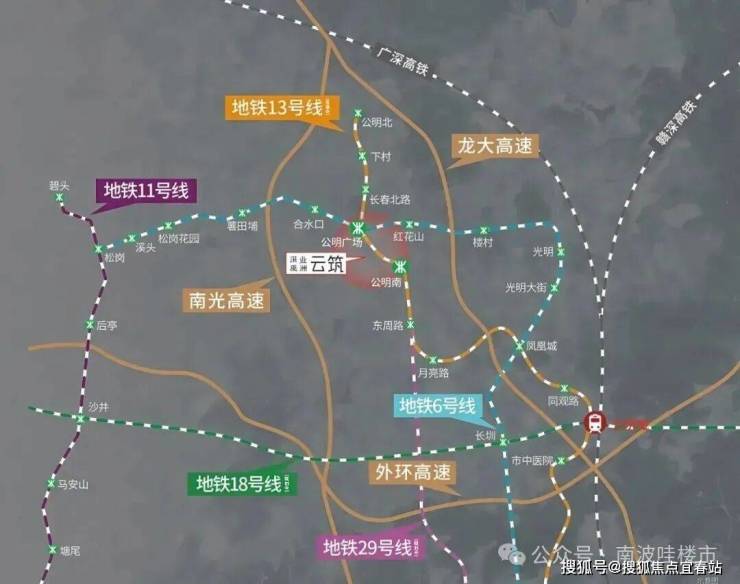 地铁配套:深业云筑2期距离在建的13号地铁线二期“公明广场站”距离1.1公里,“新庄站”(以前的公明南站)距离800米左右,另外深业云筑2期规划有公交首末站,可以快速接驳地铁站;现有的6号地铁线“公明广场站”距离有1.6公里,步行需要24分钟。