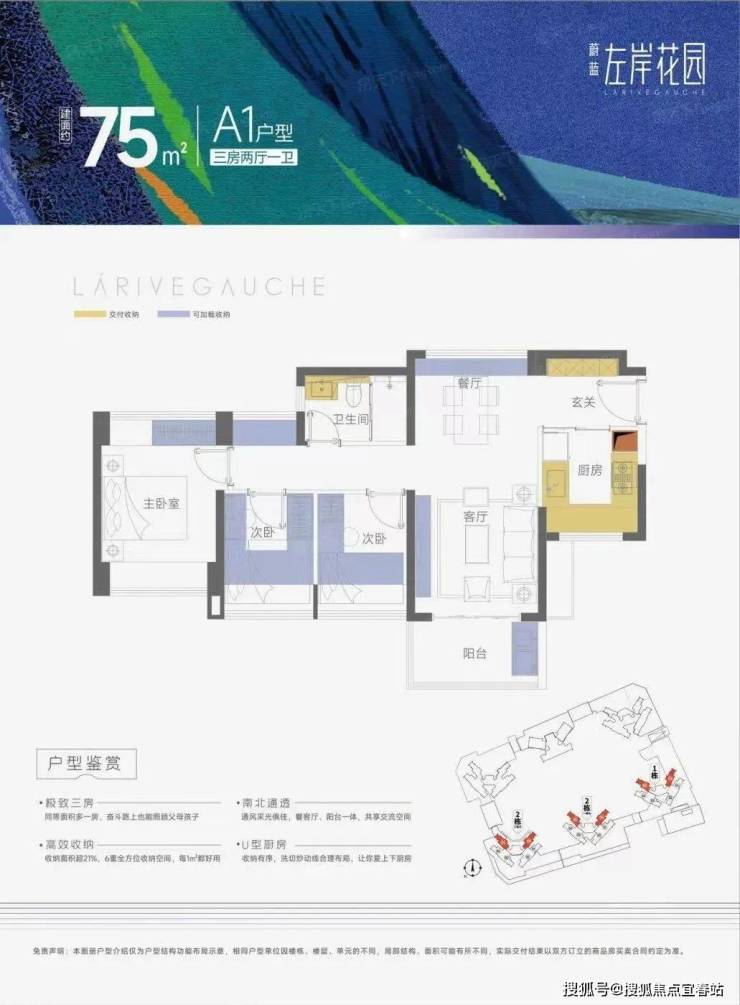 75㎡的3房2厅1卫,设计的是竖厅南北通透格局,进门入户玄关,客厅3.1米开间,三开间朝西北或东北向,3个卧室分别做到了2.9米/2.25米/2.25米的宽度,主卧南北通透设计,U型厨房,卫生间干湿分离,得房率:76.83%(不含赠送),阳台主朝西北或东北向。