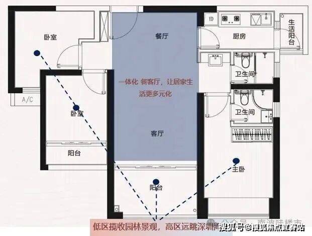 阳台阔绰:前海稀缺在售89㎡三房两卫三阳台,客厅阳台进深1.9米,揽收城园双景