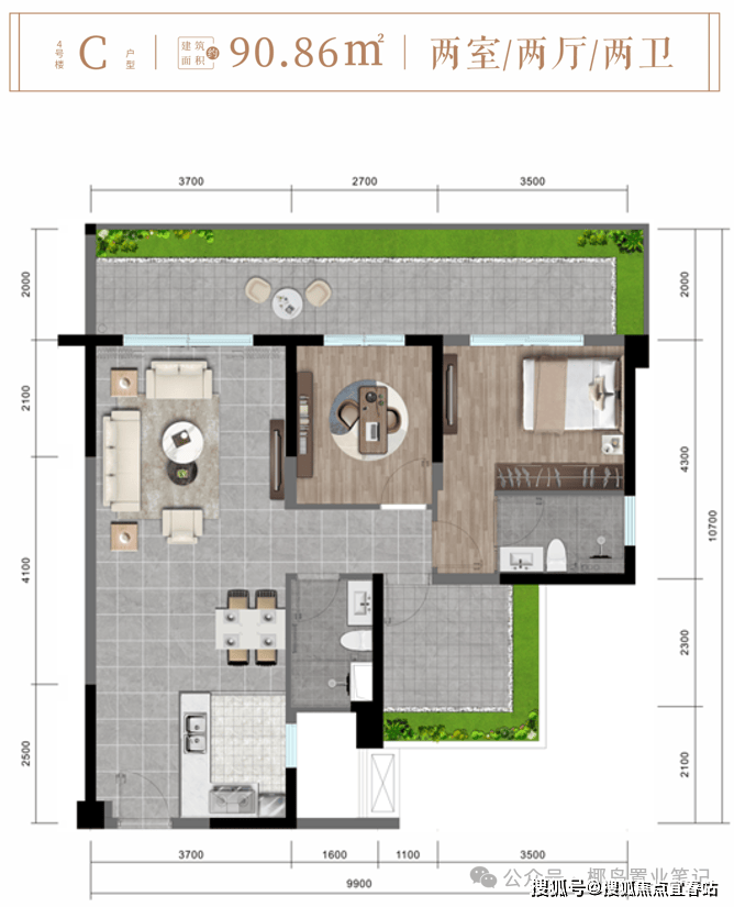 ✨4#楼C户型约90.86㎡两房两厅两卫