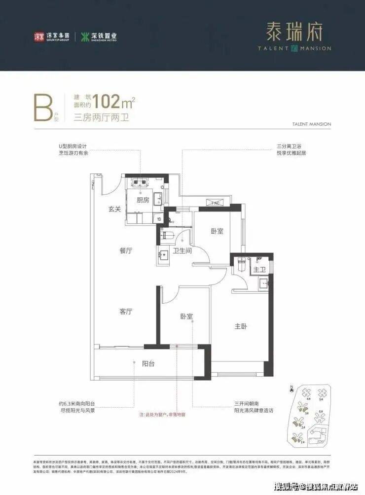 设计的是竖厅格局,进门入户玄关,客厅3.3米开间,三开间朝南,3个卧室分别做的3米/2.9/2.6米的宽度,客厅连接次卧出6米长大阳台,U型厨房,创新式卫生间分离设计,得房率:77.48%(不含赠送),西南或东南朝向。