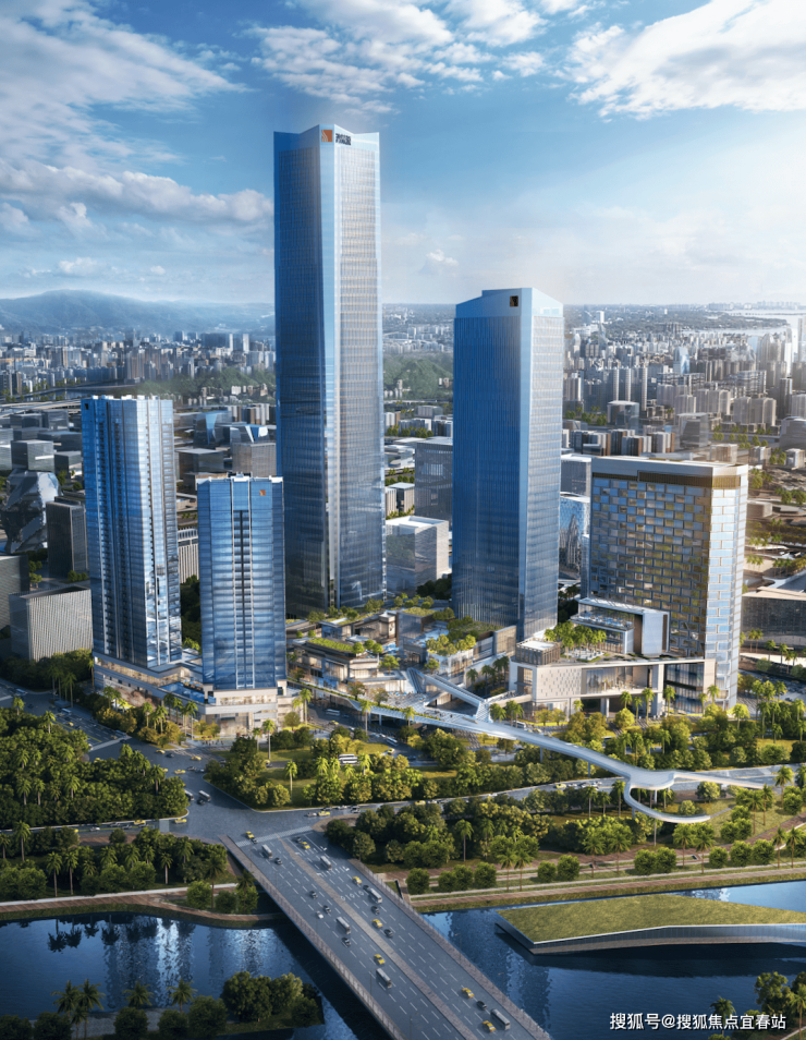 前海鸿荣源中心占地面积约5万㎡,建设用地面积约3.8万㎡,总建筑面积超34万㎡,是集办公、商业、公寓和酒店等一体开发的都市综合体。地面主要由5栋塔楼构成,包括2栋甲级办公楼、1栋国际奢华五星级酒店,以及2栋服务式公寓组成。公寓部分命名为“胤璞”,位于项目整体地块的西侧。