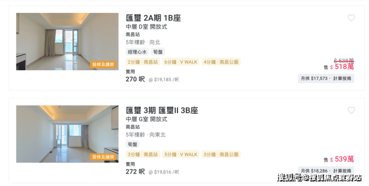 现在这个楼盘楼龄在5年左右,香港近两年楼价下跌的情况下,见目前地产放售的一些二手开放式笋盘可以低至518万。