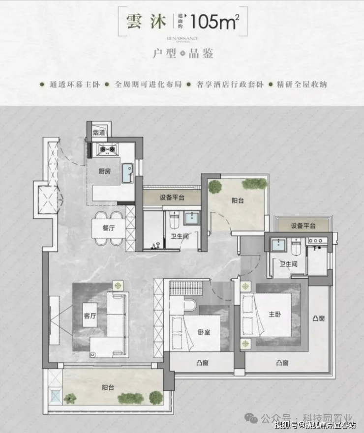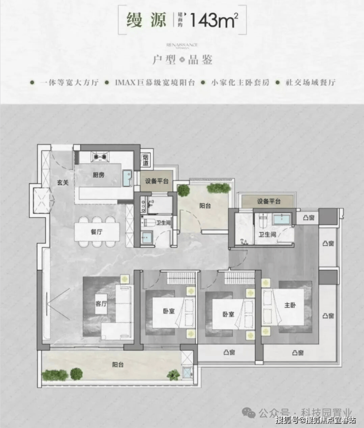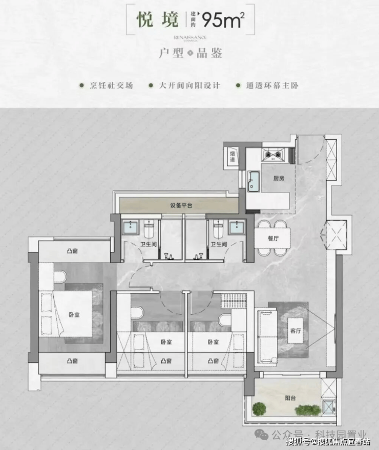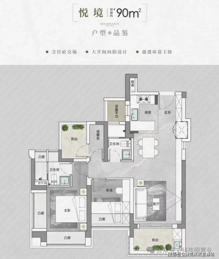 面积与户型:推售房源涵盖建面约90-95-105-143㎡的3-4房,共298套可售房源。其中,95/105㎡三房户型以朝东为主;90㎡三房户型朝西;143㎡四房大户型东南朝向。• 得房率:通过创新性的飘窗、双阳台改造、设备平台赠送等设计,实现平均94-96%的惊人得房率。