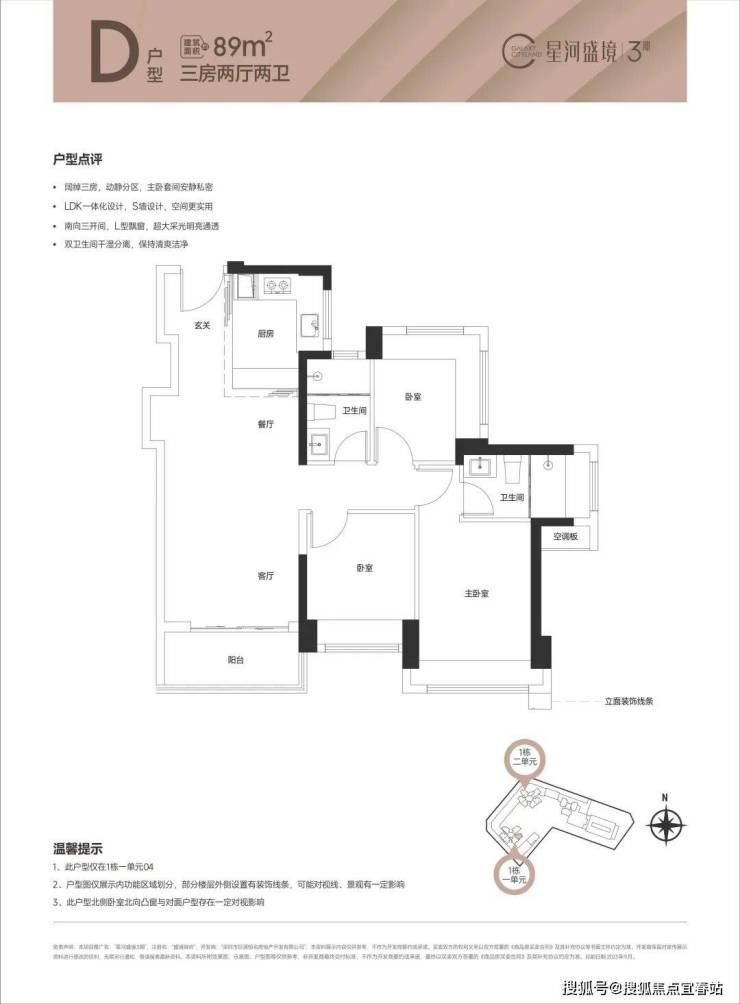 89㎡的3房2厅2卫(1栋1单元06户型),设计的是竖厅南北通透格局,全屋飘窗设计,主卧南北通透双飘窗,U型厨房,卫生间干湿分离,得房率80.08%(不含赠送),阳台主朝东北向。