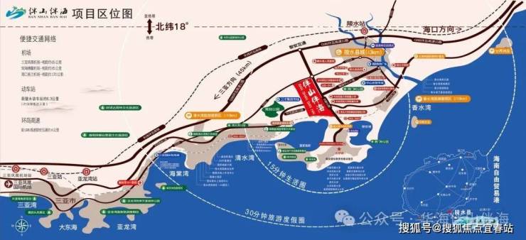 项目距三亚市区约45公里;距三亚凤凰机场车程约77公里;距陵水动车站6.3公里;距国黎安港7公里;距富力海洋欢乐世界5公里。距新村码头10公里。目前海南环岛动车已全线贯通,湾区内部市政公共交通、穿梭巴士等均已投入运营,多维高效交通网络,让您畅游岛内外。