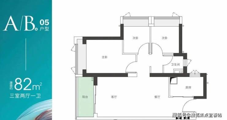 A/B座02、05户型:建面约82平方米,三房两厅一卫