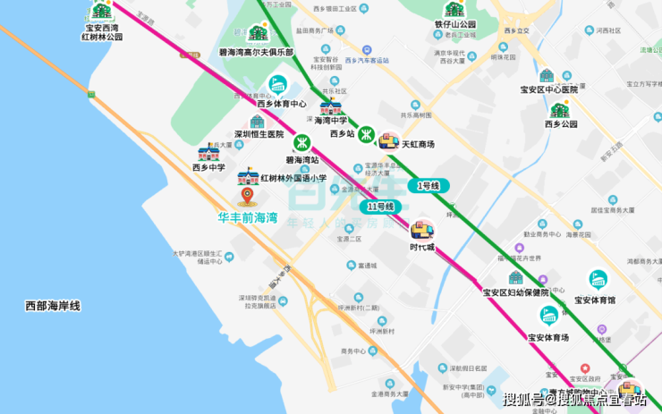 [轨]地铁1/5/11/15(建设中)号线环绕左右,项目500M可达11号线碧海湾站、10分钟达西乡站。11号是深圳颜值最高,速度最快的地铁线,一站可达机场,7站25分钟可达福田中心区,2站可达前海国际枢纽前海湾站。