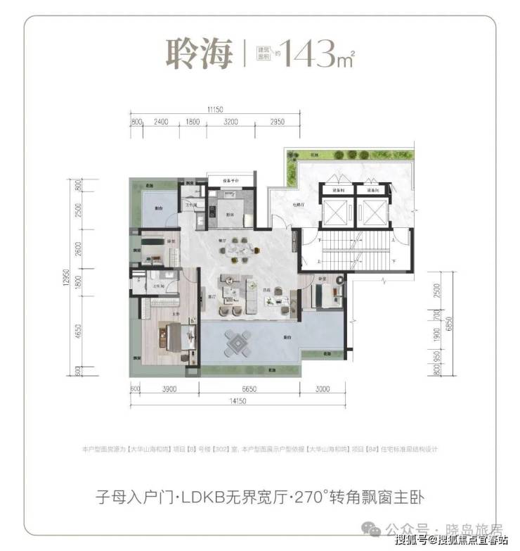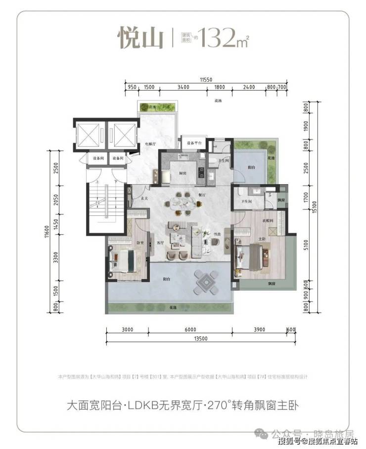 建面132㎡悦山户型:LDKB无界宽厅设计,大面宽阳台延伸生活空间,主卧270°转角飘窗,最大化吸纳山海景观。