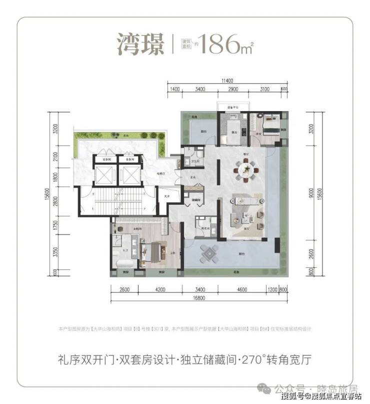 建面186㎡湾璟户型:礼序双开门设计,双套房布局搭配独立储藏间,270°转角宽厅尽显奢阔,满足高端旅居需求。