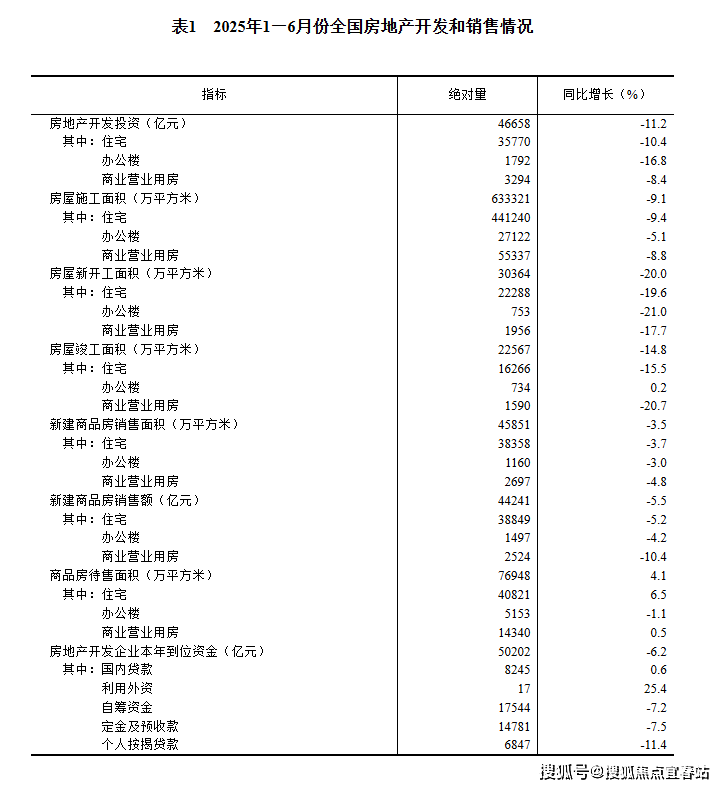 1—6月份,房地产开发企业房屋施工面积633321万平方米,同比下降9.1%。其中,住宅施工面积441240万平方米,下降9.4%。房屋新开工面积30364万平方米,下降20.0%。其中,住宅新开工面积22288万平方米,下降19.6%。房屋竣工面积22567万平方米,下降14.8%。其中,住宅竣工面积16266万平方米,下降15.5%。