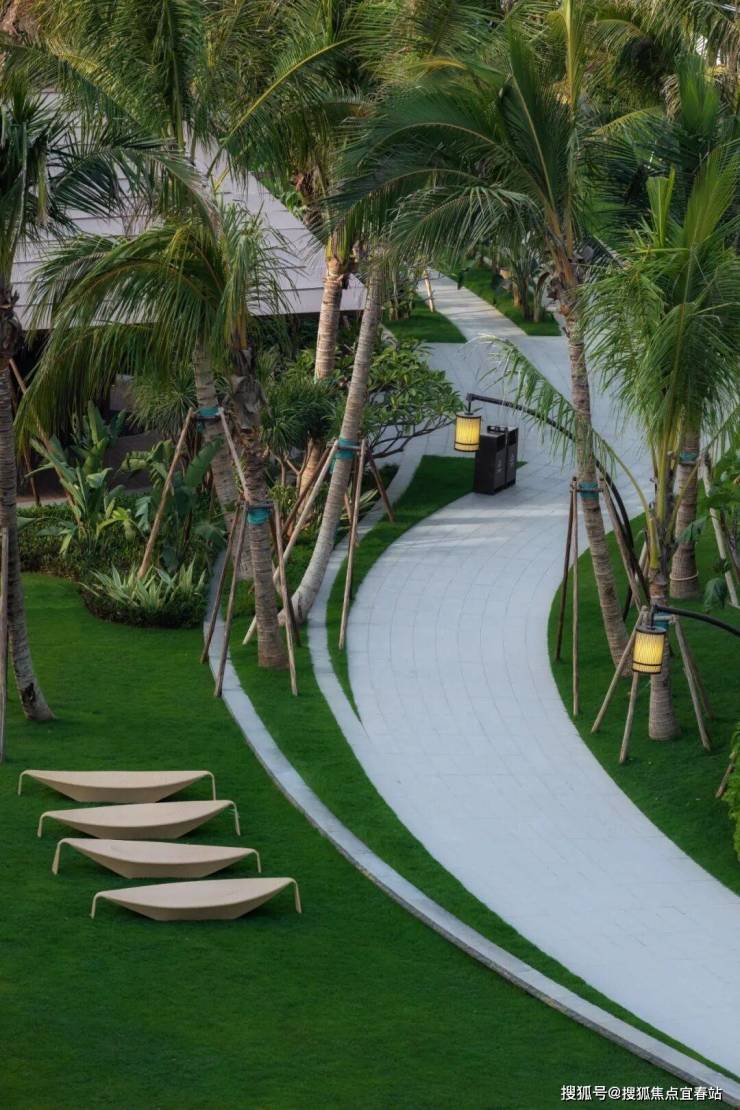 当我们第一次踏足这里的时候,清水湾的绵长沙滩和山海间的情愫深深地吸引着我们,路旁成片的槟榔林与林后的村落给我们留下了很深刻的印象,于是便有了一个隐藏在一片热带棕林背后的住区入口、雨雾弥漫的热带雨林、阳光透过的成片椰林、草阶模仿出海浪等等体现海南当地地域特征的空间设计。