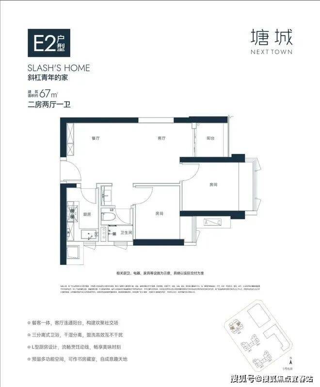 67㎡2房E2户型:位于5栋1单元05、08梯腿,东北/西南朝向,竖厅格局,客厅3.15米开间,餐客一体化设计,L型厨房,主卧约7.55㎡,得房率约80%。