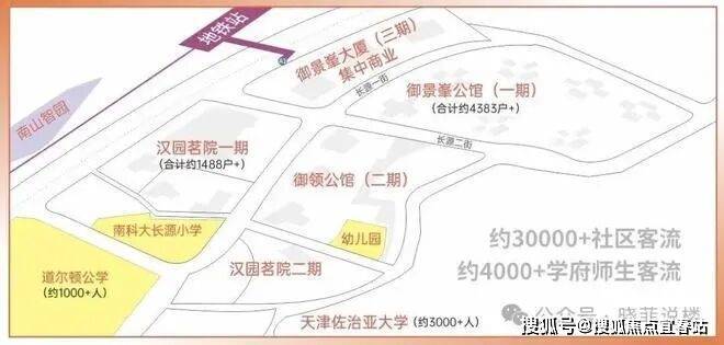 项目周边教育配套环伺,聚集960个学位的私立道尔顿公学 和 天津佐治亚大学(在建,约3000人),南科大长源小学(已开学,约1080个学位),教培消费需求旺盛。