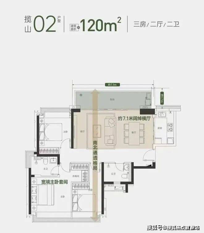01/02户型 约120㎡3房2卫横厅:客厅阳台超7.1米,尺度很大,看向小区园林以及塘朗山山景,动静分离,户型方正视野开阔,属于居住体验非常阔绰的房型。约120平房源的北向视野,从2层开始就是满目的郁郁葱葱,20层以上俯瞰整个塘朗山,东南向视野更是集山景与繁华城市于一身。