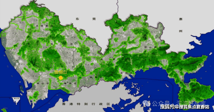 ①中心区域:深圳山海城中轴,左手香蜜湖、右手华侨城,六大总部基地环伺