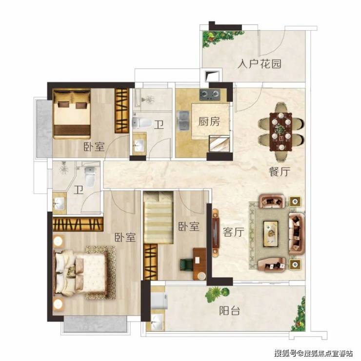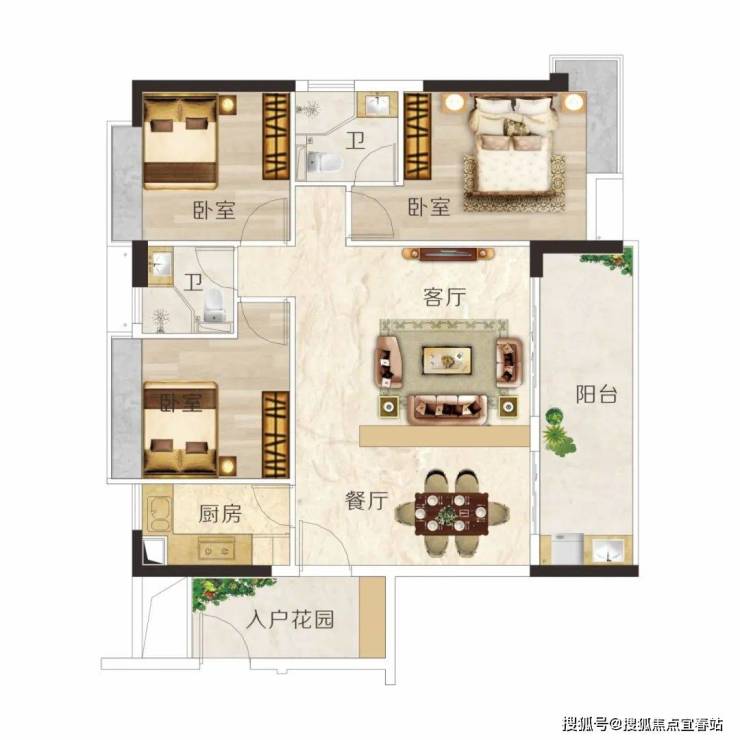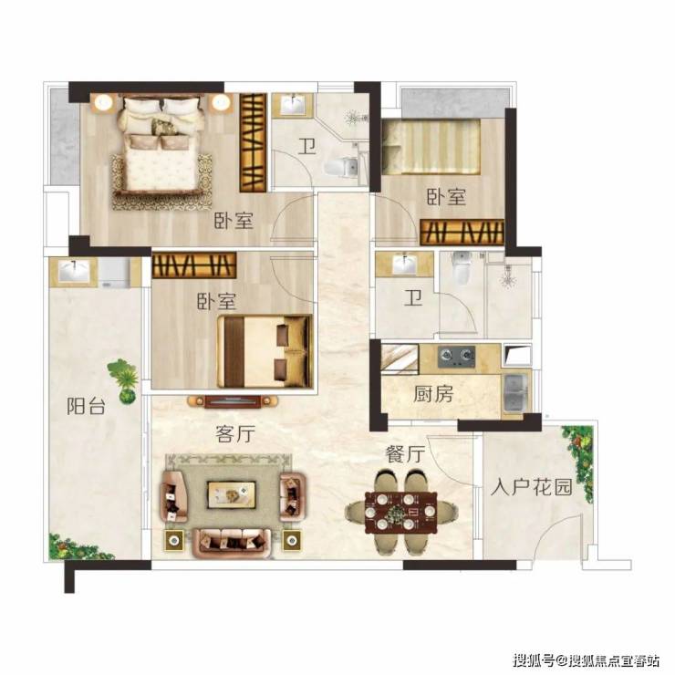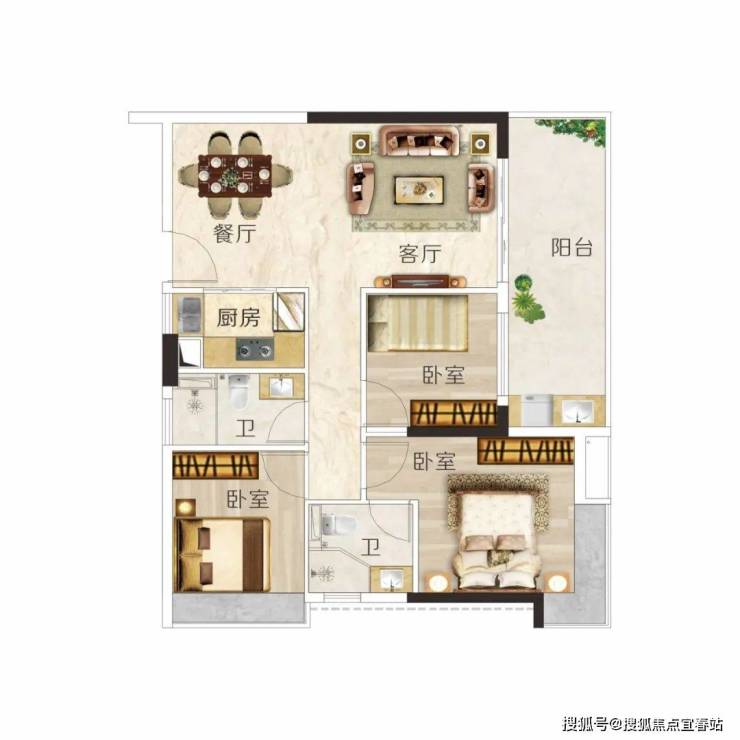 建面约106m² 3房2厅2卫,户型方正实用,动静分区,布局科学,主卧带转角飘窗,视野开阔无遮挡。