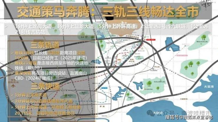 多维交通体系,通达畅行 三轨三线畅达全市,紧邻龙岗大道/盐龙大道/外环高速,30分钟到福田;地铁3号线延长线(在建中)六联站、21号线(规划中)吉坑站仅3分钟车程,深惠快轨数站直达南山。