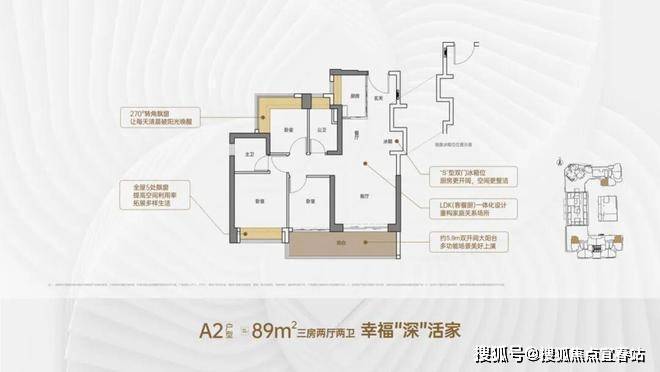竖厅格局,客厅3.5米开间,LDKB一体化,S墙设计预留冰箱卡槽位,客厅连接次卧出5.9米长的大阳台,主卧双面飘窗,次卧270°转角飘窗,全屋6面飘窗,U型厨房,卫生间干湿分离。