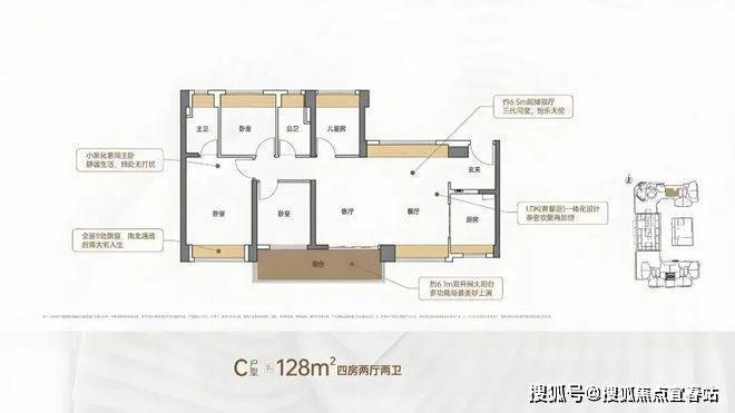 进门户玄关,客餐厅6.5米开间,LDKB一体化,客厅连接次卧出6.1米长的大阳台,主卧大套间设计,全屋8处飘窗,U型厨房,卫生间干湿分离。