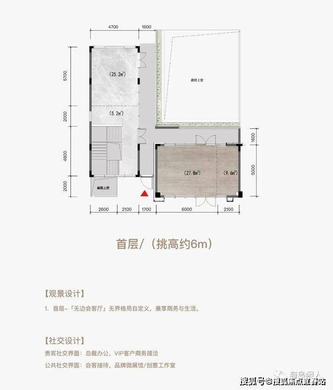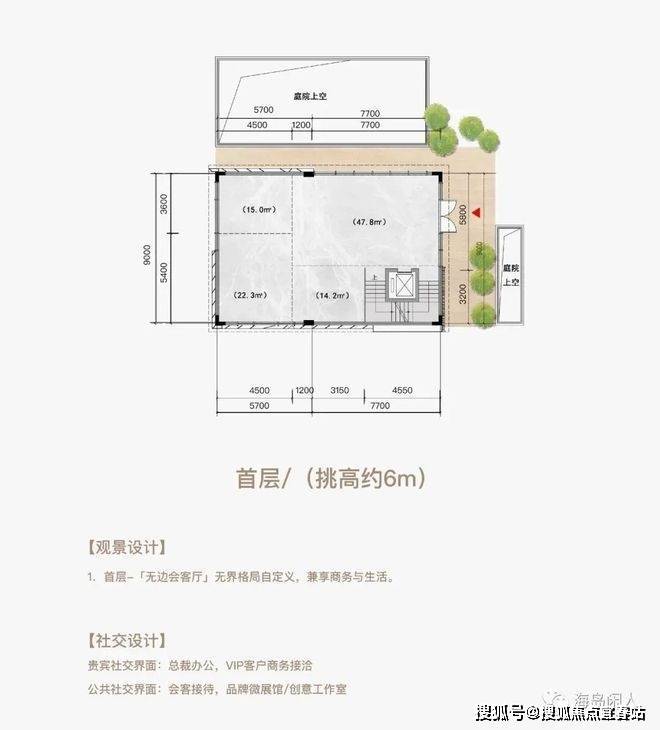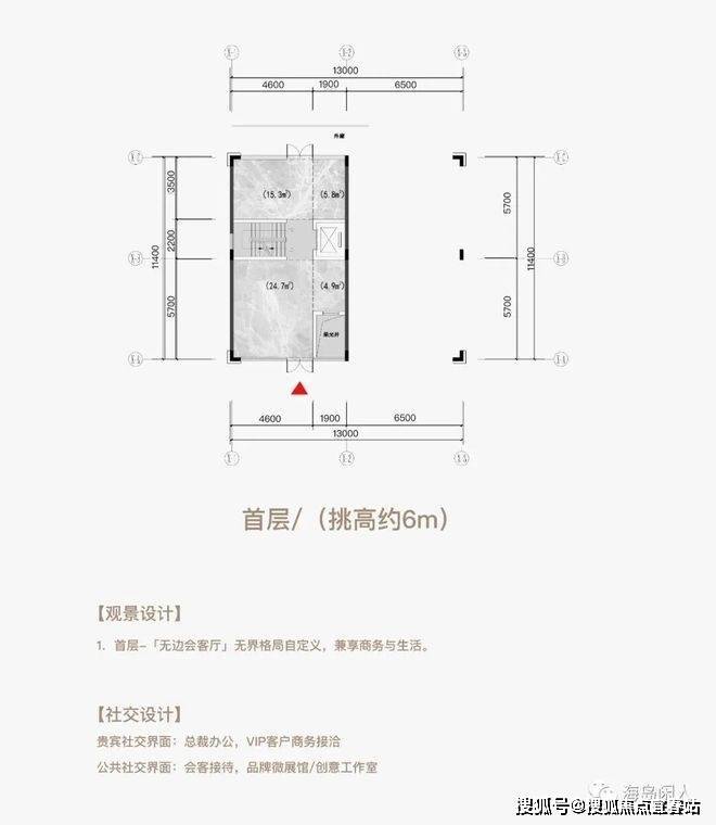 三层空间五个界面(顶层挑高约3m+首层挑高约6m+地下层挑高约6m)