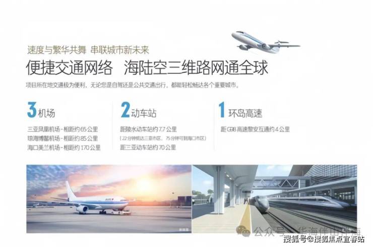 目前海南环岛动车已全线贯通,湾区内部市政公共交通、穿梭巴士等均已投入运营,多维高效交通网络,让您畅游岛内外。
