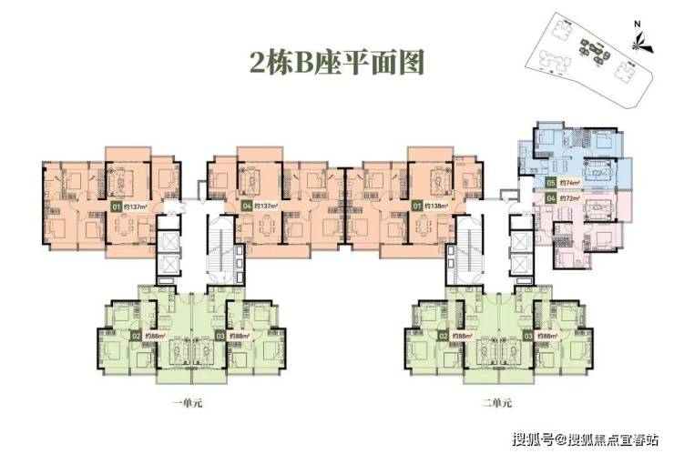 二单元2梯5户:01户型138㎡(4房);02户型88㎡(3房);03户型88㎡(3房);04户型72㎡(2房);05户型74㎡(2房)