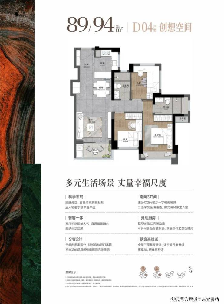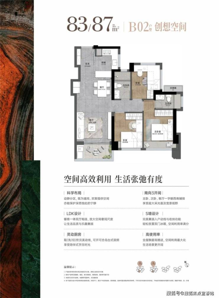03、04户型,设计的是经典竖厅格局,进门入户玄关,客厅实测3.245米开间,LDKB一体化,S墙设计预留冰箱卡槽位,三开间朝南,3个卧室分别做到了主卧13.76㎡/次卧8.28㎡/次卧7.74㎡(实测面积,不含墙体),U型灵动式厨房,卫生间干湿分离,得房率约76-81%(不含赠送),东南朝向。