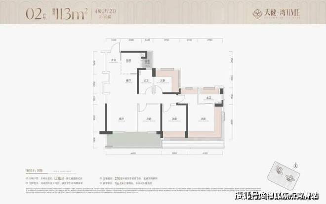 建面约113㎡正4房阳光户型LDKB一体化设计,灵动可开可合次卧设计满足家庭成长需求,约6.4m巨幕宽景阳台+270°环幕飘窗带来极目无界头排海景。