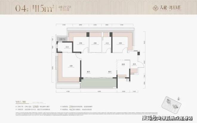 建面约115㎡正四房横厅户型采用双龙抱珠的格局,过道空间纳入客餐厅中,空间尺度更显阔绰。约6.3m的巨幕阳台南向观景,拥揽头排奢尺海景!
