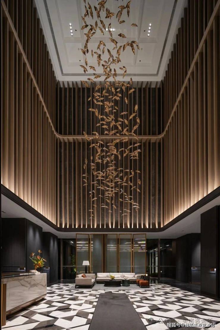 酒店式归家大堂由HBA操刀,四季酒店/柏悦酒店/东方文华酒店等酒店大堂/室内设计是其杰作。该社区大堂以“潮起烁金”为设计理念,复古金属材质和木制组合,特色大理石拼花为迎宾礼,传递质感、高雅、奢华的业主品味。约18米的超级高度,将酒店仪式感与业主高雅气派极限衬托。▽