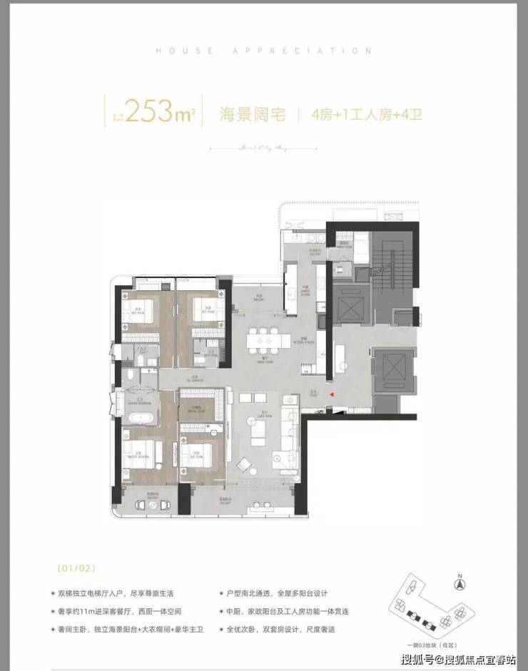 建面约253平的4房+1保姆房+4卫,住宅性质,超奢阔享受型大宅。