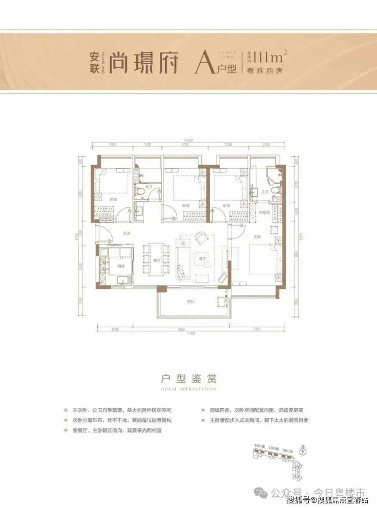 建面约111平4房,户型方正、大飘窗、全明户型、宽敞双卫设计,空间感好,功能性强,适合多人口家庭上车。