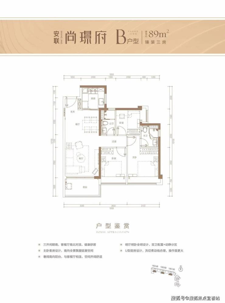 户型面积布局B89平三房两厅两卫设计的是经典竖厅格局,客厅3.5米开间,LDKB一体化设计,三开间朝南,动静分区,分别做到了主卧12.68㎡/次卧9.41㎡/次卧7.02㎡(包含墙体飘窗),U型厨房,卫生间干湿分离,得房率约78.2%(不含赠送),阳台6.3m²正南朝向。套内面积69.82m²+赠送面积8.85m²=实用面积78.67m²,加上赠送后得房率约88.1%。