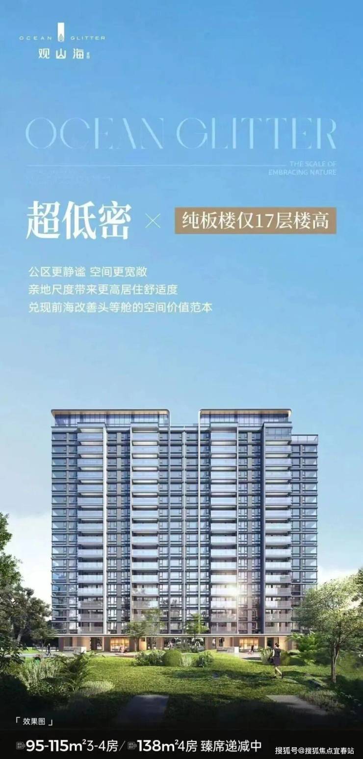 前海唯一低密大社区,270度大小南山景,无保障房,纯享改善宽宅。观山海家园项目基本信息占地面积:约4.2万㎡ 建筑面积:约16.3万㎡ 容 积 率:2.75绿 化 率:30%使用年限:70年(2023-2093)总 户 数:共10栋,870户首推户数:3栋(共260套)总楼层:17-25层层高:3米梯户比:2梯4户面积:约95-110-113-115-138平首推面积:约110-115平4房使用率:约95%--100%