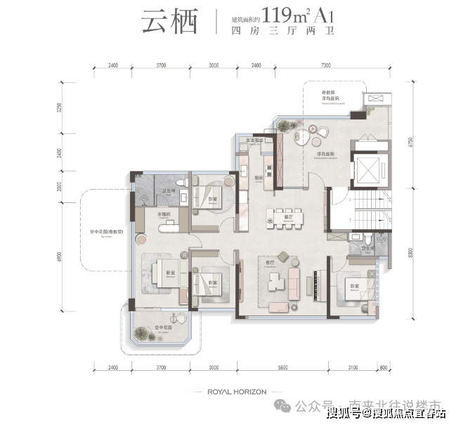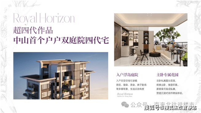 中山首例户户双空中庭院社区 ,奇偶错层立体构序设计,匠筑至高约7米挑高庭院,奢享约145%极致得房率!标准层高臻至3.5米,入户浮岛花院衔加专属空中花园,一梯一户专梯尊享,著序中山首座酒店式超四代奢宅!