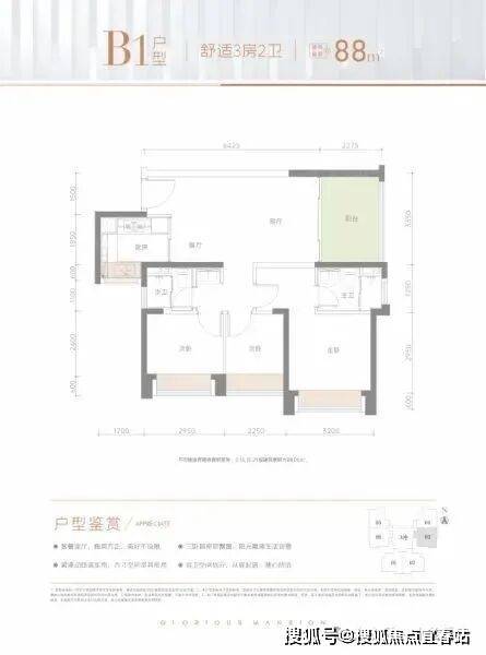 88㎡的3房2厅2卫,1栋A座06户型,竖厅格局,LDKB一体化设计,动静分区,三个卧室都朝南向,U型厨房,公卫三段式分离,阳台正东朝向。