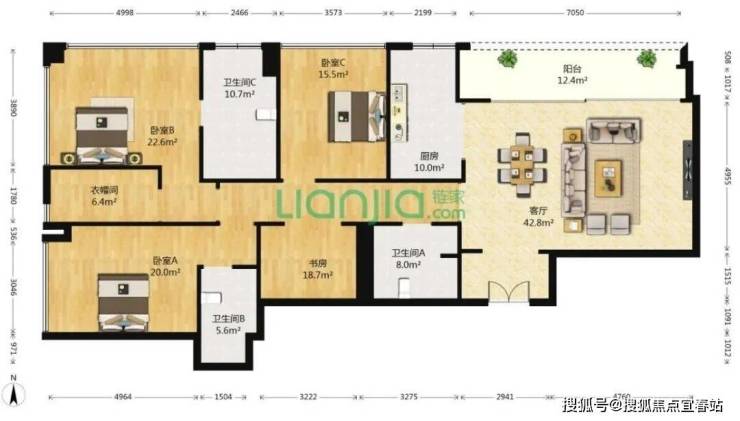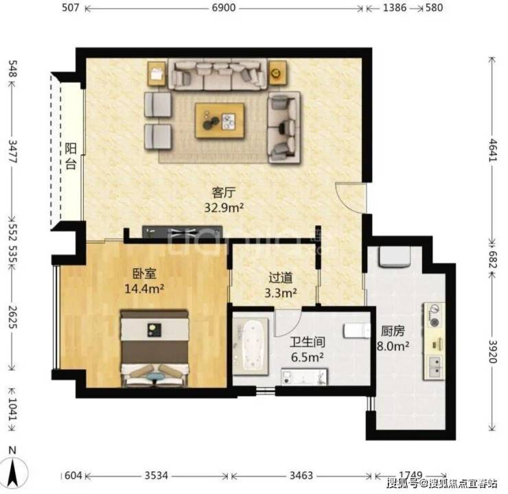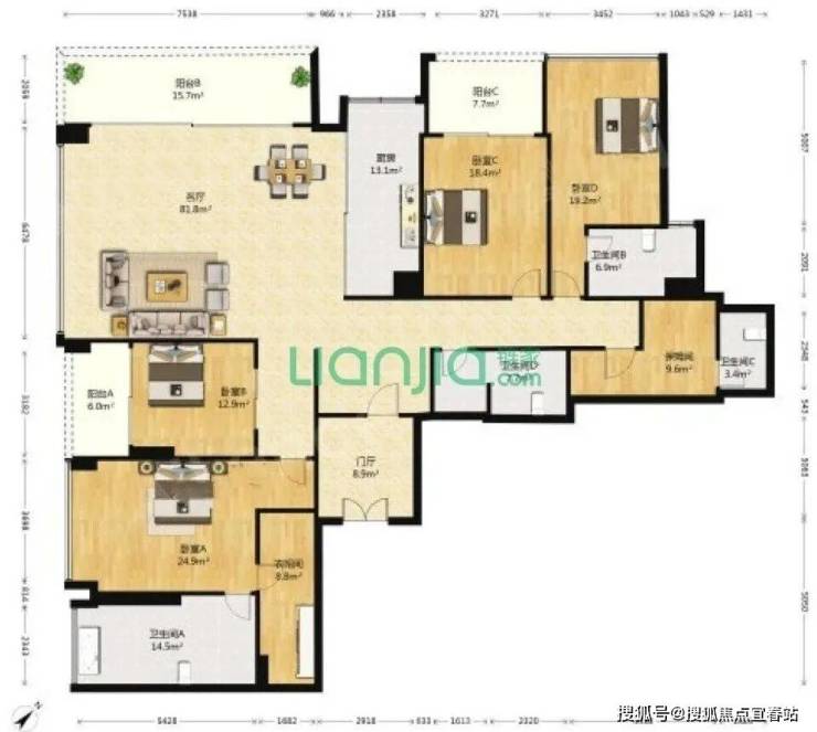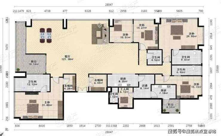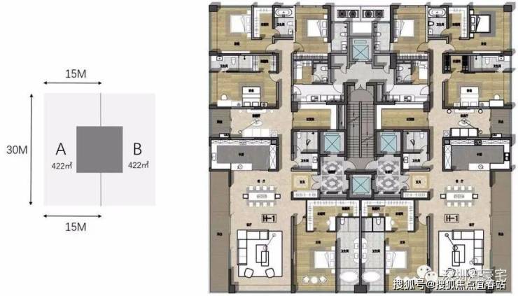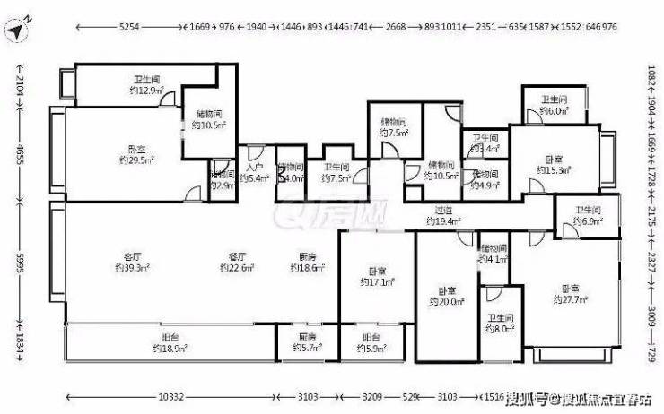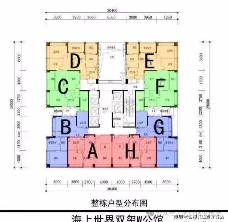 1栋共37层,3梯2户:A户型398平朝西北,B户型为397平朝东南。