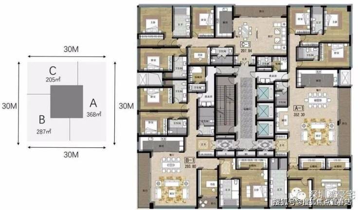 3栋共33层,3梯3户:A户型367平朝东,B户型287平朝南,C户型205平朝东北。